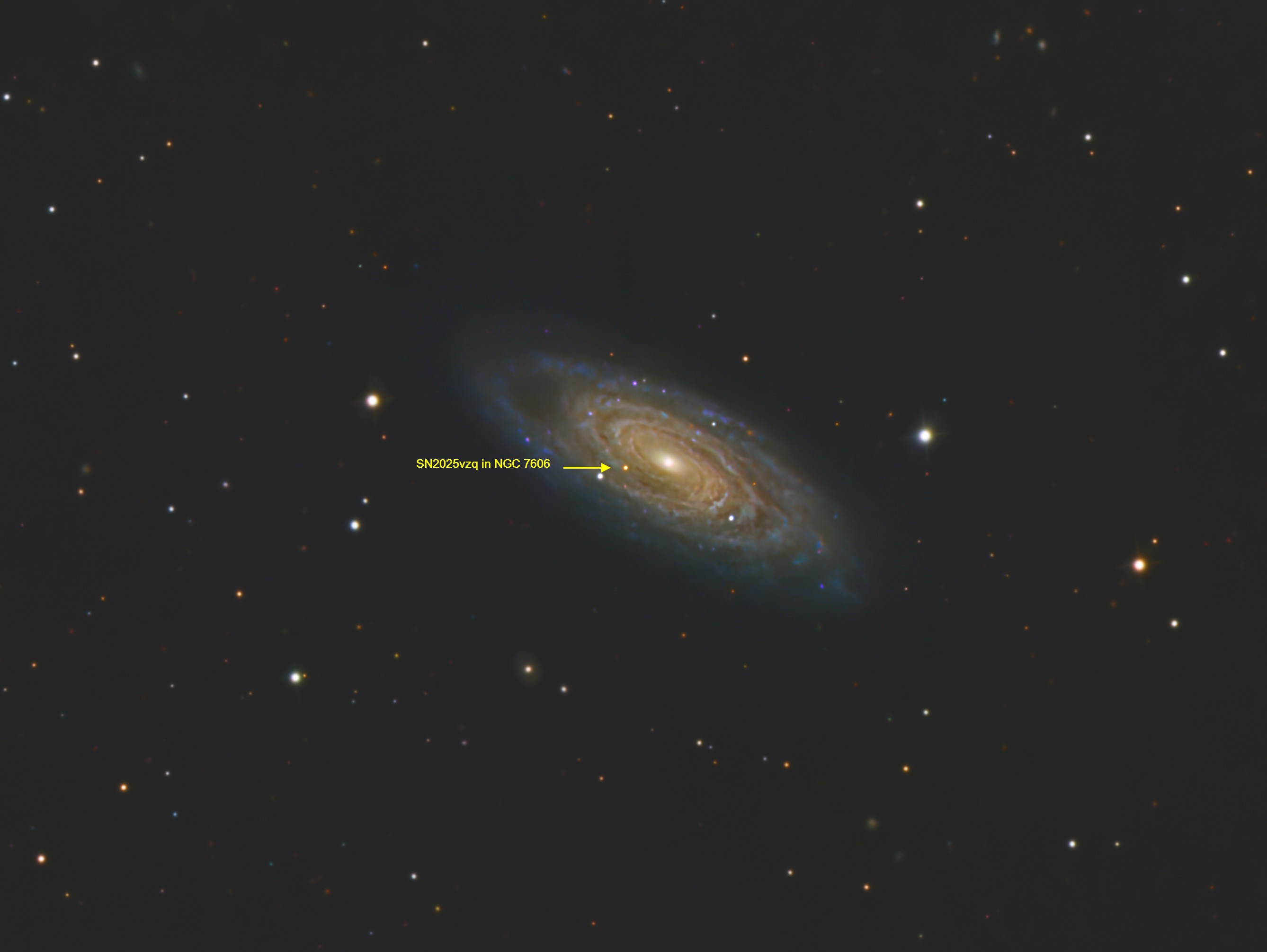 NGC 7331 with Supernova SN2025vzq imaged by Rok Palčič on September 21, 2025 with Rezman 3 telescope (60 cm f/7) and ASI 2400MC camera. 3 hours 20 minutes exposure, image resolution is 0.29 arc seconds per pixel..